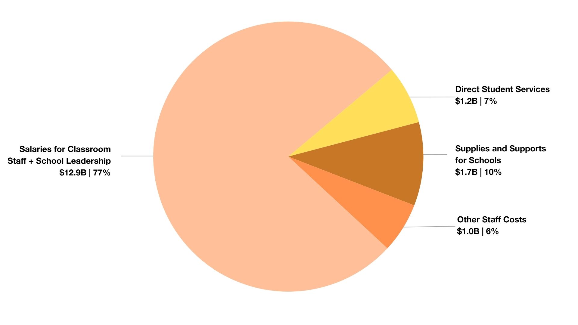 - $12.9 billion - Salaries for Classroom Staff and School Leadership, accounting for 78,000 teachers; 5,400 principals, assistant principals, and deans; 5,500 social workers/school counselors; 3,000 school secretaries; 22,000 paraprofessionals; and about 4,000 other staff